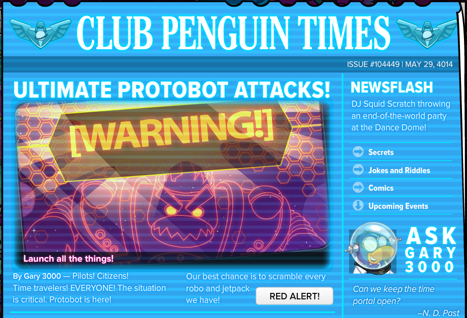 The future of Club Penguin is in jeopardy, Protobot has returned and is wreaking havoc on the island!